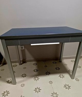 Mesa auxiliar con un diseño moderno y funcional. Mesa de muy buena calidad y como nueva, sin marcas, ni arañazos. - Superficie extensible. - Incorpora un cajón para almacenamiento adicional. - Patas de metal con acabado gris. - Tablero con veta de madera en tono marrón. Silla y mesa 100 €