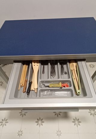 Mesa de cocina Largo 130cm Ancho 80cm Alto 75xcm Extensible hasta 185cms y con un pequeño cajón. - Tablero de madera con acabado natural en muy buen estado (siempre ha estado protegida con un mantel) - Patas de metal plateado con el esmalte un poco levantado en la parte más baja de las patas (por el uso)