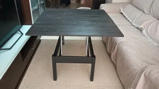 Mesa de madera que se expande para convertirse en mesa de comedor. - Diseño elegante y funcional. - Acabado en tono marrón oscuro.
