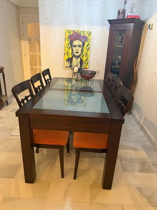 Conjunto de mesa de comedor extensible con seis sillas. - Mesa de madera maciza - Sillas de madera maciza con asiento de tela beige y respaldo de madera con diseño de celosía. Medidas 140x90. Con posibilidad de entenderla a 210x90 (solo media mesa) y 280x90 (mesa completa). La vendemos por falta de uso. La mesa tiene pequeñas marcas de uso y las sillas estan en perfecto estado. Solo hay una de las patas de la mesa esta fuera de su anclaje, pero sostiene perfectamente.