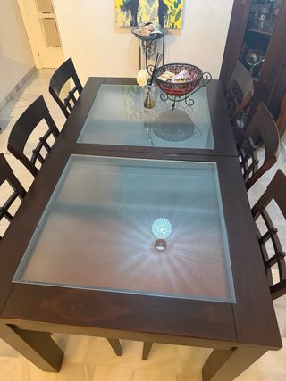 Mesa de comedor de madera con un diseño moderno y funcional. Su superficie presenta detalles en cristal que le dan un toque elegante. - Mesa extensible. - Acabado en madera oscura con detalles en cristal.
