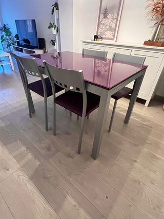 Conjunto de mesa con sobre de cristal morado y cuatro sillas a juego. - Diseño moderno y elegante. - Patas de las sillas y estructura de la mesa en color gris. - Asientos y respaldos de las sillas en color morado. - mesa extensible: 140 (180) cm, alto 75cm profundidad 80cm.
