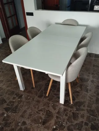 Mesa extensible con superficie de cristal. - Diseño moderno y elegante. - Acabado brillante. -El cristal esta resquebrajado, al abrir la mesa queda debajo y no se ve. - Las sillas se venden a parte del precio del anuncio. - El precio del anuncio es solo por la mesa. urge porque nos hemos comprado otra y tenemos esta en medio