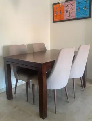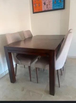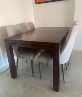 Mesa extensible + 4 sillas Mesa de comedor en madera color nogal, medidas 180 x 100 cm, extensible hasta 230 cm, ideal para 6-8 comensales. Incluye 4 sillas tapizadas en color marrón con diseño acolchado en rombos y patas negras metálicas. Muy cómodas y en buen estado. Conjunto elegante para salón o comedor. En Reus.
