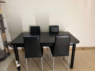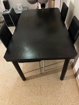 Mesa de comedor negra, de madera, en buen estado. Es extensible y se incluye con seis sillas. - medidas: 1.40x84x74 (sin extender) - Color: Negro - Material: Madera - Incluye seis sillas: están firmes pero les hace falta una mano de pintura