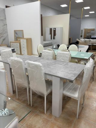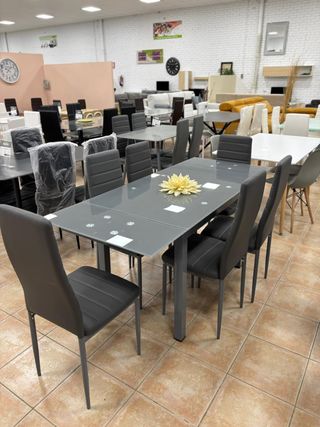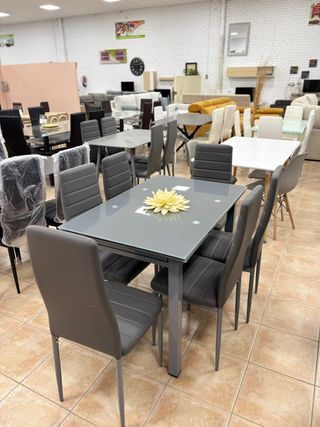 Conjunto Mesa de cristal EXTENSIBLE ideal para 6 u 8 personas + 6 sillas tapizadas en polipiel con estructura de metal inoxidable 100% reistente - Diseño moderno - Disponible en 2 colores gris - blanco - Cristal templado de 8mm de espesor MEDIDAS: Medidas Mesa: *Alto: 74 cm *Ancho: 70 cm Largo: 110 cm (cerrada) y 170 cm (abierta) Medidas Silla: *Alto: 95,5 cm *Ancho: 40 cm *Largo: 40 cm . Pago en casa . Entrega domicilio llámanos al 66.7.9.6.3.13.6.