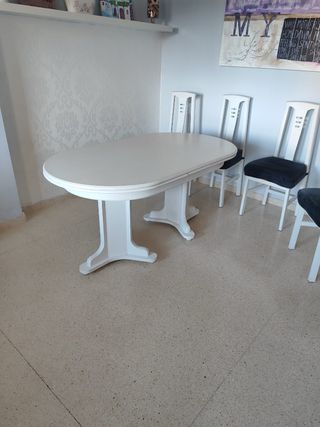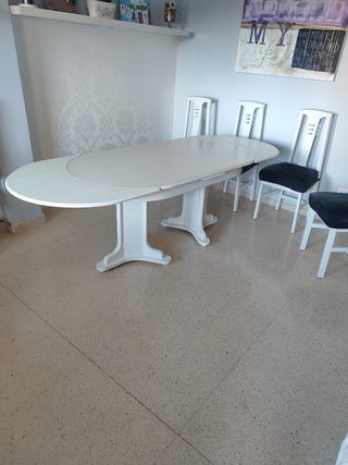 Mesa de cocina de madera en color blanco, con un diseño extensible. Tiene un pequeño desperfecto entre los dos cajones (ver foto). - Acabado liso y elegante. - Patas robustas para mayor estabilidad. *Possibilidad de adquirir las sillas a juego por 20€