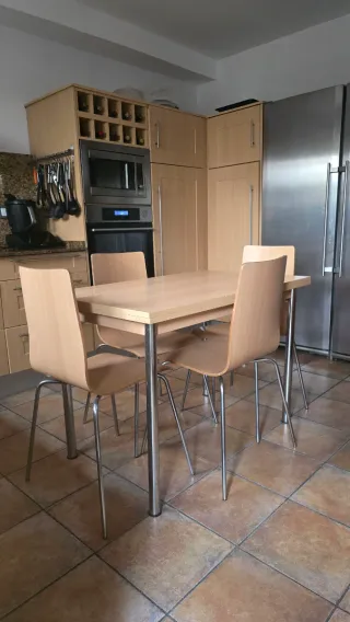 Conjunto de mesa y cuatro sillas para cocina o comedor. - 1 Mesa de madera clara con patas metálicas. 100 €. Medida 69x104 y ampliable +25 y+25 de cada ala - 4 Sillas de madera contrachapada con patas metálicas. 80€ Se puede comprar por separado. Las sillas pueden quedar bien en un comedor moderno. Las sillas estan perfectas. La mesa tiene un poco de desgaste en los laterales, pero se soluciona con un bonito mantel.