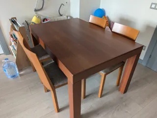 Mesa de comedor con diseño moderno y funcional. Su sistema extensible permite adaptarla a diferentes necesidades. - Medidas cerrada: 135 cm de largo x 90 cm de ancho. Extensible a 182cm o a 229cm (depende de si sacas 1 al o las 2) - Estructura robusta de madera. 100eur la mesa 140eur si te llevas la mesa y las 4 sillas