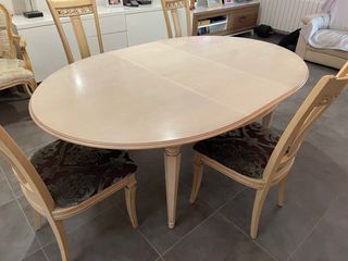 Preciosa mesa de comedor ovalada La mesa es extensible, perfecta para cenas con invitados. Esta en muy buen estado y tiene un diseño elegante y clásico. - Mesa ovalada extensible a 180 cm - Color beige claro, decape - Estilo clásico - Madera maciza, muy resistente - Patas desmontables, atornilladas - Comprada: Muebles La fabrica - sillas no se venden...Solo mesa