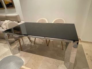 Mesa de comedor con superficie de cristal templado negro y patas blancas. Es extensible, lo que resulta muy práctico en el día a día y cuando vienen visitas. Diseño moderno y minimalista. Tiene algún arañazo que se puede apreciar en las fotos. Mesa sin extender 160cm de largo. Mesa extendida 200cm de largo