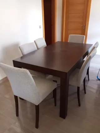 Conjunto de mesa de comedor con seis sillas. Incluye mesa auxiliar De muy buena calidad. - Mesa extensible de madera oscura. - Sillas tapizadas en tela gris. - Mesa auxiliar. Medidas de la mesa grande: Largo: 160 cm Ancho: 90 cm Se pueden extender los laterales otros 45 cm por cada lado.