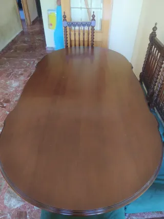 Mesa de madera maciza extensible. Con un diseño clásico y robusto. Perfecto estado. 8 sillas a juego, con tapizado perfecto y sin arañazos. Perfectos para restaurar pintando de blanco. Regalo 2 relojes, uno de pared y otro dorado, y conjunto vasos. - Base de pedestal.