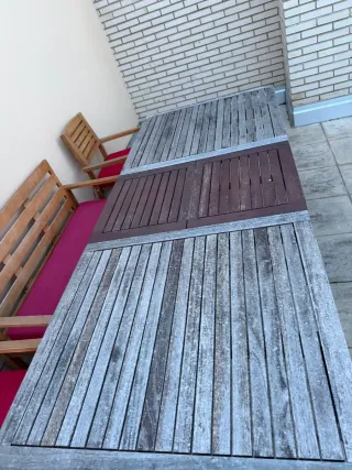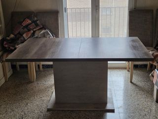 Conjunto de mesa de comedor y mesa de centro a juego. - Diseño moderno. - Acabado en madera. *medida mesa pequeña ancho 75 , largo 1,20 *medida mesa grande 85 x 160 extensible a 180