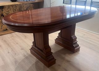 Elegante mesa de comedor ovalada, fabricada en madera maciza. Su diseño clásico y robusto la convierte en una pieza central para cualquier hogar. - Acabado en tono marrón oscuro. - Base con dos columnas talladas. - Borde de la mesa con detalle decorativo.