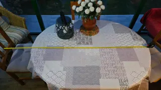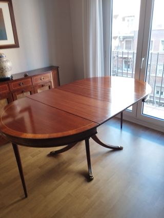 Mesa redonda de madera con diseño extensible. - Patas de madera robusta. - Superficie con acabado mate. - Mecanismo de extensión funcional. La medida abierta es 90x120 Las sillas están bien pero tienen algun rasguño en el respaldo.