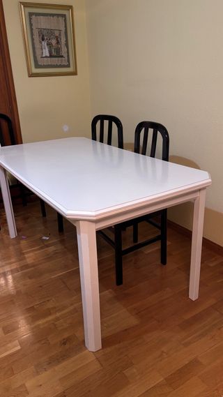 Conjunto de mesa con tablero plegable y tres sillas a juego. - Mesa de madera extensible y bonitas patas macizas. - Medidas: Alto 74,50 cm Ancho 44 cm y largo 150 cm. Al extenderla pasa a medir 88 x 150 cm - Tres sillas de madera con asientos tapizados a juego. Medidas de las sillas: Ancho 36 cm, fondo 44 cm y 103 cm de alto el respaldo Todo está en buen estado pero con algún roce del uso normal