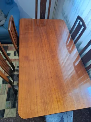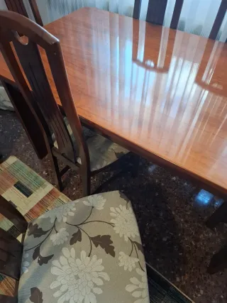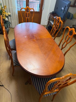 Conjunto de mesa extensible y seis sillas. Hay que ir a buscarlas a un pueblo 60km de zgz - Mesa de madera con superficie ovalada. - Sillas con asientos tapizados.