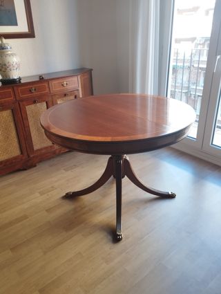 Elegante mesa redonda extensible, perfecta para tu salón o comedor. Su diseño clásico y acabado en madera la convierten en una pieza central. - Acabado en tonos madera y detalles dorados. - Diseño extensible para adaptarse a tus necesidades.