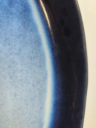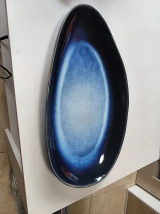 Elegante centro de mesa con un diseño ovalado y un acabado degradado en tonos azules y negros. Su forma y material lo hacen ideal para cualquier estancia. - Material: Cerámica. - Colores: Azul y negro.