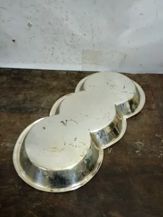 Centro de mesa vintage con un diseño elegante y tres compartimentos. Con suciedad y desgaste. Mide 2x22,5x10,5. - Fabricado en hierro. - Diseño ovalado con tres cavidades. - Detalle grabado en el centro.