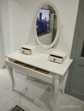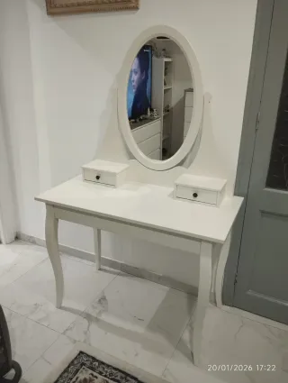 Elegante tocador HEMNES ikea con espejo ovalado. - Diseño clásico y funcional. - Dos cajones pequeños para almacenamiento. - Patas curvas con un toque de estilo.