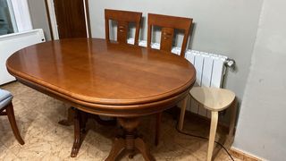 Elegante mesa de comedor con un acabado en madera natural. Perfecta para reuniones familiares. - Diseño ovalado. - Patas robustas de madera. - Superficie amplia y lisa. Tiene dos alas ampliables una por cada lado de 40 cms. Es maciza de pino teñido
