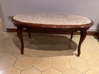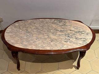 Elegante mesa de centro con un diseño clásico y sofisticado. Precio negociable - Tapa ovalada de mármol con vetas multicolor. - Base y patas de madera oscura. - Patas con diseño curvo y ornamentado.