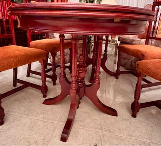 - Fabricada en madera maciza. - Forma ovalada. Mesa para 8 personas. Mide 82 cm aproximadamente de ancho, 180 cm de largo y unos 75 cm de alto. La mesa tiene alguna mancha y picotazos, como se pueden ver en las fotos, pero está en muy buen estado. Existe la posibilidad de venderla junto a las 6 sillas, de madera también. Aparecen en la última foto, un poco borrosas, ya que están guardadas en otro lugar y no he hecho foto actual. Están en un piso tercero, pero probablemente no quepa en el ascensor, ya que no se puede desmontar. Mesa sola: 100€ Mesa + 6 sillas: 150€ Recogida en mano en Collado Villalba