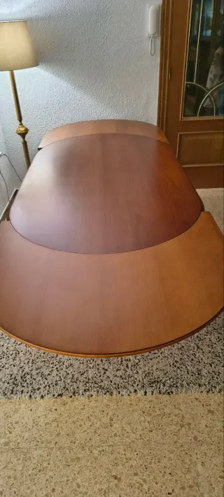 Mesa de comedor clásica de madera, extensible, de forma ovalada. Se abre fácilmente para ampliar capacidad, ideal para comidas familiares o invitados. ⚠️ Importante: presenta desgaste visible en la zona central de apertura, donde el barniz ha perdido color (ver fotos). Estructuralmente está firme y es totalmente funcional, el desgaste es estético. Características: Mesa extensible Madera tono caoba Base central robusta Estilo clásico Ideal para comedor o salón 📍 Recogida en mano (no se envía)