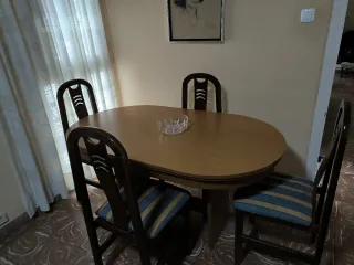 Conjunto clásico a juego: mesa redonda extensible + 4 sillas + cristal protector. Mesa: 110 cm de diámetro cerrada (redonda) y 144 cm abierta (ovalada). Cristal redondo Ø110 incluido, en buen estado. Estructura firme y muy cuidada, acabado brillo tipo raíz; solo microarañazos leves de uso. Sillas clásicas, estables y en buen estado. Recogida en Valencia (Primero CON ASCENSOR). Carga y transporte a cargo del comprador. No envío. Se puede ver sin compromiso. Opción de pack con mueble boiserie que se ve en las fotos (consultar).
