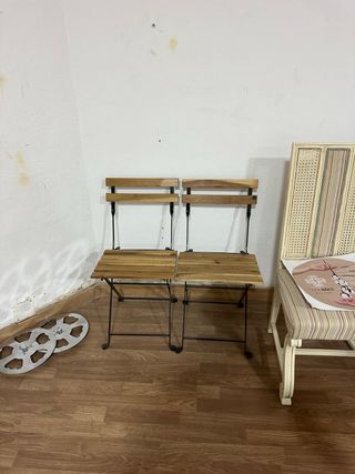 Conjunto de mesa y dos sillas plegables, perfectas para tu jardín o balcón. Fabricadas con una combinación de madera y metal. - Diseño plegable para fácil almacenamiento. - Ideal para espacios exteriores.