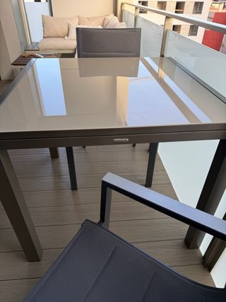 Conjunto de terraza compuesto por una mesa de cristal extensible de 135cm a 270cm y seis sillas. Ideal hasta 12/14 personas. La mesa y las sillas son de metal, con asientos de tela color gris. Algunas sillas presentan desgaste en la tela, pero tienen arreglo o recambio en tienda. Solo es una la que está peor. El resto bien. Perfecto para disfrutar del buen tiempo al aire libre.