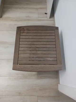 Mesa de balcón con superficie de madera y estructura plegable. - Tablero de madera teka. - Patas metálicas plegables. No se hacen envios. Se entrega en Barcelona. Medidas 55cmx 55 cm