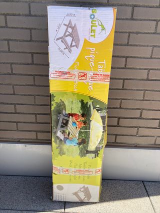 Mesa de picnic de madera para niños (3-7 años) sin montar, tal y como se vendió originalmente y se puede apreciar en las fotografías. La mesa montada tiene unas medidas de 0,5 m de alto y de 0,9 m de ancho como de fondo. Los bancos miden 25 cm de alto y admite 4 niños (peso máximo 35 kgs). Está equipada con un agujero para sombrilla (no incluido). Para que pueda resistir las inclemencias del tiempo, está fabricada con madera lasurada color topo. No requiere un anclaje al suelo. ATENCIÓN: para poder realizar el envío, hay que elegir como empresa a Correos y no a Inpost (Inpost rechaza el envío por tamaño del paquete).