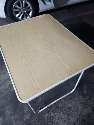 Mesa versátil, ideal para usar en el campo o en la playa. Su diseño combina materiales resistentes para mayor durabilidad. - Superficie con acabado imitación madera. - Bordes en color blanco. En buen estado. Precio negociable. No hago envíos.