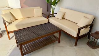 Conjunto de muebles de exterior en teca. 2 sillones 1 sofá 2 mesas - Estructura de madera super resistente. Falta acondicionar y nutrir.