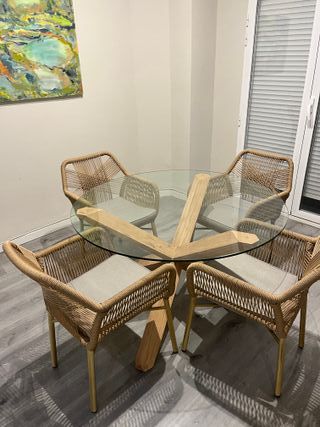 Conjunto de mesa con sobre de cristal y cuatro sillas de ratán, ideal para interior o exterior. Se encuentra en excelente estado. To be picked up by buyer - Patas de metal y base de madera. - Cojines incluidos para las sillas.