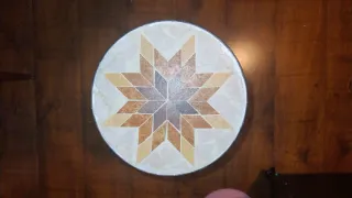 Mesa de mosaico con un diseño geométrico y colores tierra, ideal para exteriores. - Mosaico de cerámica y piedra. - Tonos beige y blanco. - hacemos todo tipo de mesas de mosaicos poe encargo a todas medidas y colores