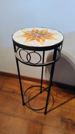 Mesa auxiliar redonda con un bonito diseño de mosaico. Patas de hierro. La parte superior es bastante pesada. De uso decorativo. Entrega en mano en Madrid centro.