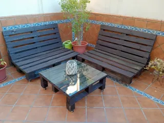 Conjunto de muebles hechos a mano con palets, ideal para exteriores. - Incluye sofá y mesa. - Diseño rústico y resistente. - no hago envios, solo recogida en zona moncloa