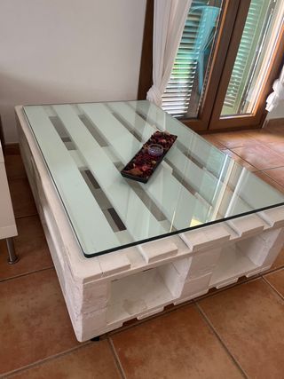 Mesa auxiliar hecha con palets, pintada en blanco y con tapa de cristal. - Diseño rústico y moderno. - Ideal para salones o terrazas.