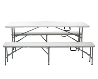 Mesa plegable de 152cm, versátil para uso en exteriores o interiores. - Superficie de plástico resistente. - Patas de metal plegables para fácil almacenamiento. - Asa de transporte integrada. También tenemos bancos plegables a parte de 180cm de largo. tengo muchas unidades y también otras medidas: 120cm a 12€ 152cm a 16€ 180cm a 23€ 240cm a 30€