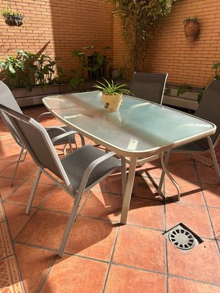 Vendo conjunto de mobiliario de exterior ideal para terrazas pequeñas o balcones. Está compuesto por una mesa redonda con sobre de cristal templado y dos sillas plegables a juego. Detalles: - Mesa: Estructura metálica blanca con tablero de cristal. Muy estable y fácil de limpiar. - Sillas: Modelo plegable de listones, muy prácticas porque no ocupan nada de espacio cuando se guardan. Estado: Usado pero en buen estado general. Solo presenta el desgaste típico de estar en exterior (ver fotos). Condiciones de venta: ⚠️ IMPORTANTE: Venta exclusiva en persona. No realizo envíos debido al volumen y al cristal de la mesa.