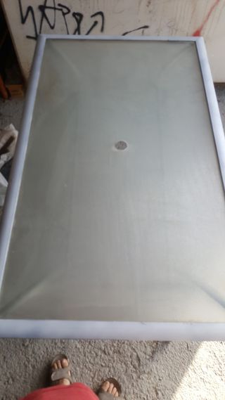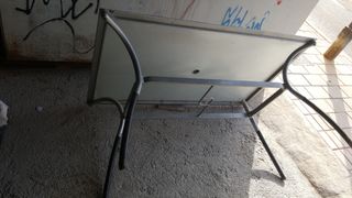 Mesa de cristal con agujero en el cetro para la sombrilla, con el marco de aluminio pintado en blanco , soporte de aluminio pintado en gris y patas de madera pintadas de negro , se puede pintar todo de nuevo . Mide 142 X 86 cm y de alto 75 cm . Carlos 686 95 90 85. Un saludo.