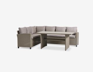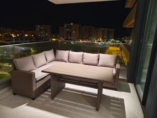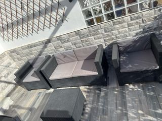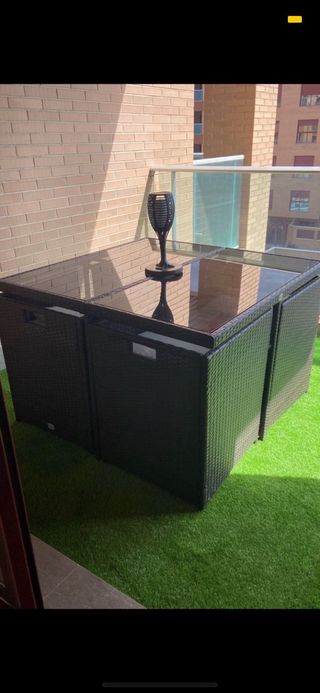 Elegante conjunto de sofá chaise lounge y mesa a juego, todo a estrenar, montado pero sin usar (perdí el ticket y veo que ocupa demasiado espacio en mi terraza). Comodísimo, se puede ver sin compromiso. Tiene las etiquetas. Con cojines de lujo incluidos. Precio en tienda 1400 euros. El sofá puede separarse en 2 partes si se desea. A recoger en Almería capital. MEDIDAS: 180 x 240 de largo. De alto, 73 cm y de profundidad, 65. Cualquier cosita, pregúntame :)