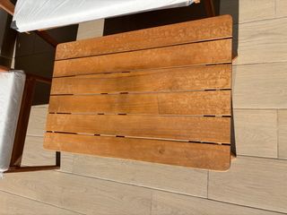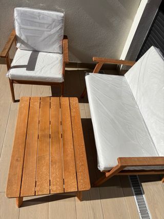 Conjunto de jardín de madera de acacia. - Un sillon individual. - Un banco de dos plazas. - Mesa auxiliar (sin mantel). Incluye los cojines hechos a medida de plastico protectores del tejido. no se envia, solo venta en persona. Debido al sol, seria conveniente lijar y barnizar.