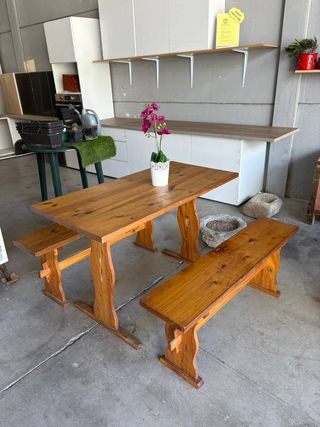 ✅ Ref. B11066 Mesa y dos bancos fabricados en madera de buena calidad de color marrón claro. Se trata de una mesa rectangular y alargada que va acompañada de dos bancos estrechos y rectangulares. Es un conjunto perfecto para colocarlo en una zona exterior del hogar como un jardín o un patio. Como se puede observar en las fotografías tanto la mesa como los bancos se encuentran en buenas condiciones. 📐 Medidas Bancos (ancho x fondo x alto): 112x25x45cm. Mesa 113x55x75cm. Financia tus compras de forma inmediata. Visita nuestra web Cardiffstore o nuestra tienda en Baza (C/ Marte, 6 Pol. Ind. La Noria); Llámanos o envíanos un WhatsAp