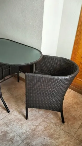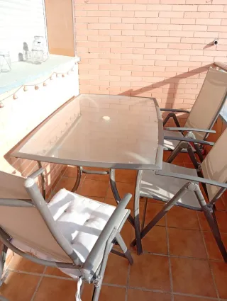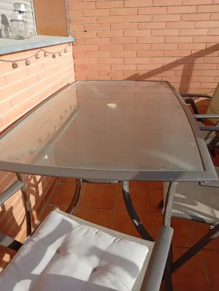 Vendo conjunto de jardín con 4 asíentos con sus cojines espalderos y de asiento , ya montado. NO ENVÍO, RECOGIDA EN DOMICILIO En perfectas condiciones Con cristal , tal cual la foto. Tiene un año y apenas ha sido usado MEDIDAS 110x110x73 MESA Sillas 52,5 x53x67.5. 6.8 kilos 1 Peso máximo soportado por la mesa: 85 kg Peso máximo soportado por la silla: 150 kg
