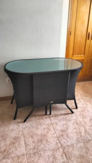Conjunto de mesa de exterior con superficie de cristal y estructura de ratán. - Poco uso. - Incluye dos sofás y dos taburetes.